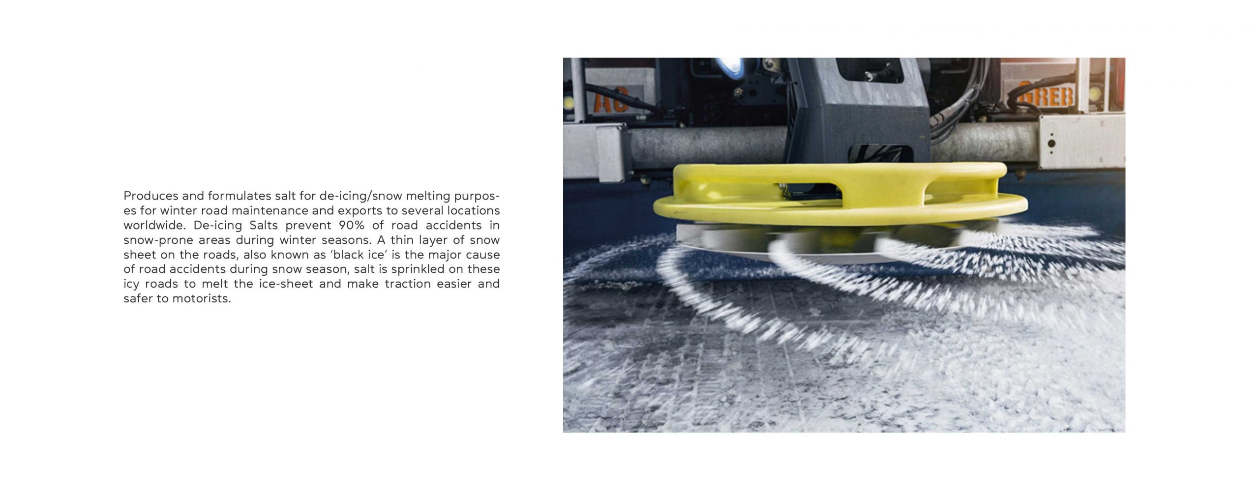 Produces and formulates salt for de-icing/snow melting purposes for winter road maintenance and exports to several locations worldwide. De-icing Salts prevent 90% of road accidents in snow-prone areas during the winter seasons. A thin layer of snow sheet on the roads, also known as ‘black ice’ is the major cause of road accidents during snow season, salt is sprinkled on these icy roads to melt the ice-sheet and make traction easier and safer to motorists.