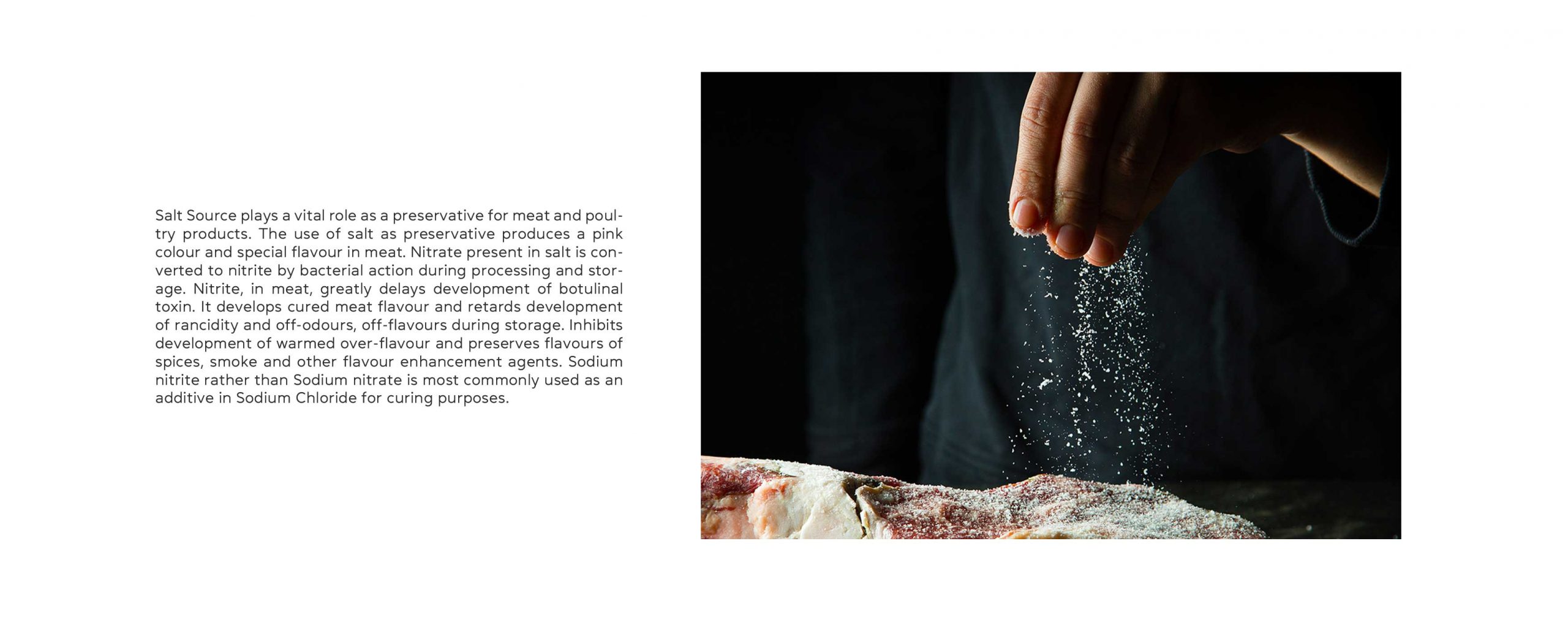 Salt Source plays a vital role as a preservative for meat and poultry products. The use of salt as a preservative produces a pink color and special flavor in the meat. Nitrate present in salt is converted to nitrite by bacterial action during processing and storage. Nitrite, in meat, greatly delays the development of botulinal toxin. It develops cured meat flavour and retards the development of rancidity and off-odours, off-flavours during storage. Inhibits the development of warmed over-flavour and preserves flavours of spices, smoke and other flavour enhancement agents. Sodium nitrite rather than Sodium nitrate is most commonly used as an additive in Sodium Chloride for curing purposes.