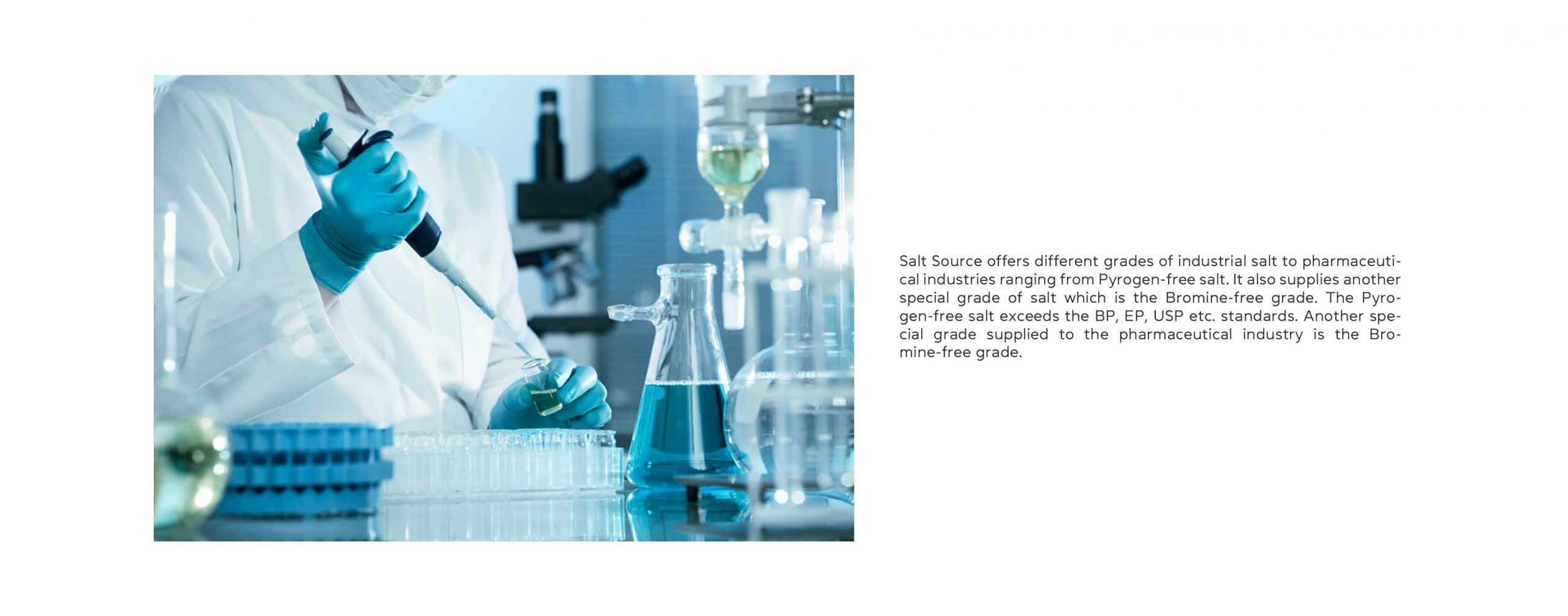 Salt Source offers different grades of industrial salt to pharmaceutical industries ranging from Pyrogen-free salt. It also supplies another special grade of salt which is the Bromine-free grade. The Pyrogen-free salt exceeds the BP, EP, USP etc. standards. Another special grade supplied to the pharmaceutical industry is the Bromine-free grade.