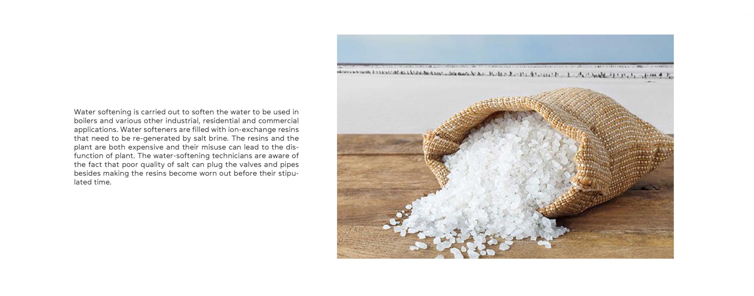 Water softening is carried out to soften the water to be used in boilers and various other industrial, residential and commercial applications. Water softeners are filled with ion-exchange resins that need to be re-generated by salt brine. The resins and the plant are both expensive and their misuse can lead to the disfunction of the plant. The water-softening technicians are aware of the fact that poor quality of salt can plug the valves and pipes besides making the resins become worn out before their stipulated time.